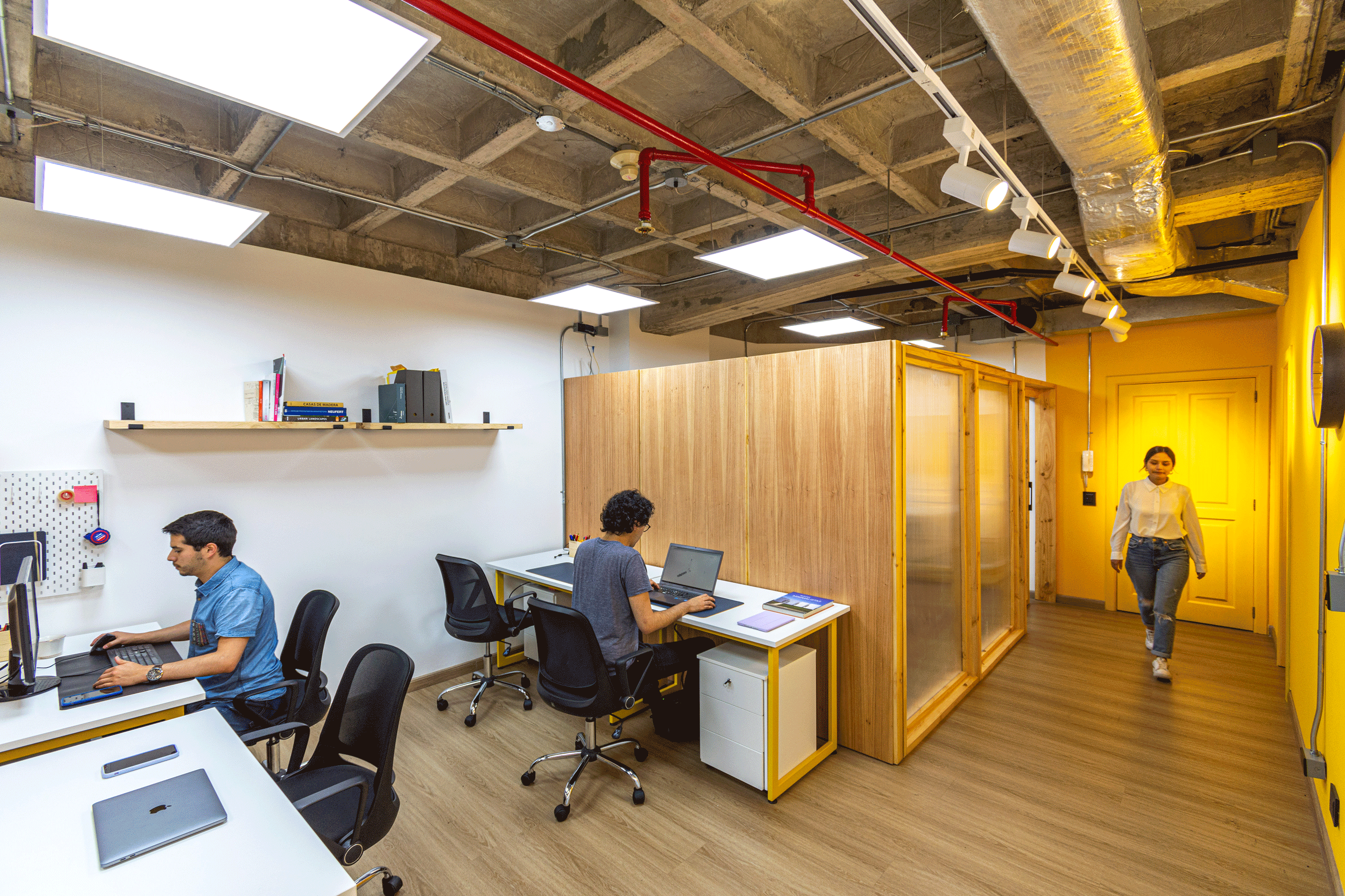 El espacio termina de definirse a través del uso de piezas de mobiliario que fueron diseñadas para complementar colores y panelería. Las mesas de trabajo personal van de la mano de un “arturito” y de elementos decorativos para mantener la organización del espacio de trabajo.